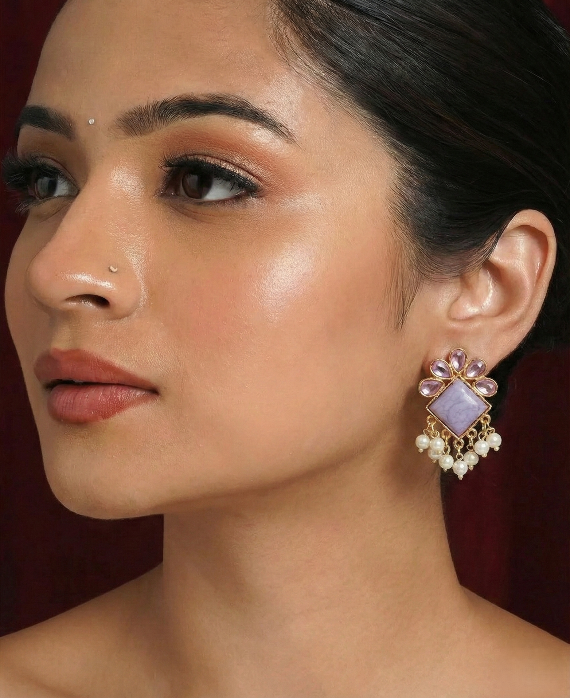 Add a touch of feminine grace to your ensemble with these stunning drop earrings. Set in a warm gold-tone finish, each earring features a delicate floral stud crafted with light purple stones, leading down to a matching square lavender center stone. The design is beautifully finished with a playful cluster of small, white faux pearl drops that sway with every movement. Perfect for festive occasions, weddings, or pairing with traditional ethnic wear.