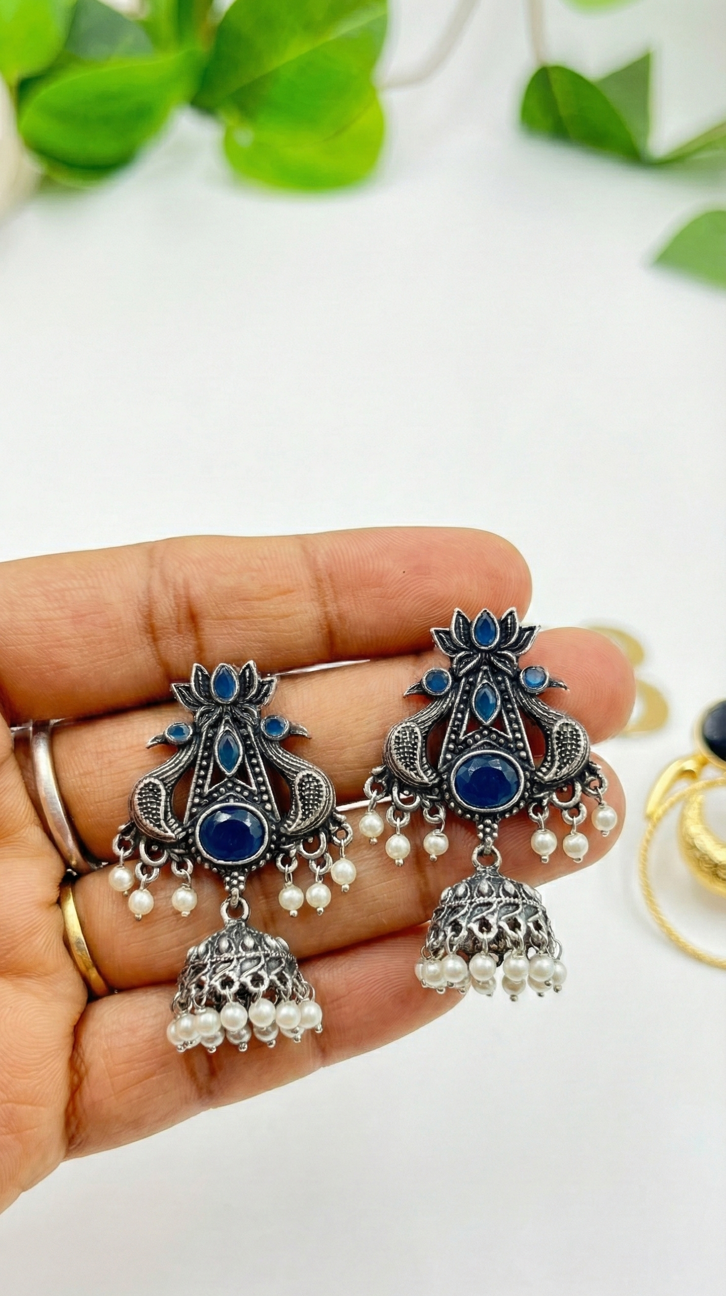 Elevate your ethnic look with our Royal Azure Peacock Jhumkas. Expertly crafted with a premium oxidised silver finish, these earrings feature intricate peacock motifs centered around a deep blue stone. Finished with delicate clusters of white pearls, they offer the perfect blend of traditional charm and boho-chic style. Lightweight and comfortable, they are the perfect accessory for your next festival or wedding celebration.