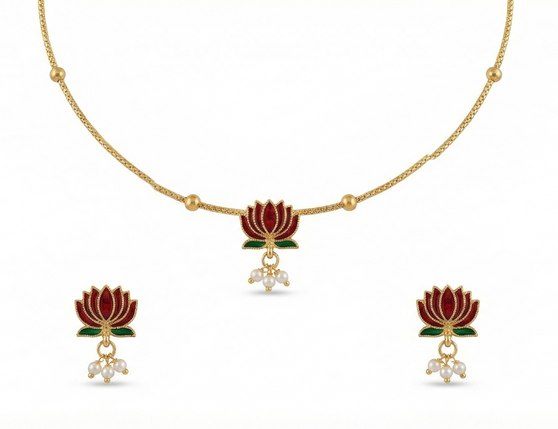 Available as a delicate single-pendant chain for daily elegance or a statement choker for festive flair, each piece is finished with dainty pearl drops that add a touch of grace. Symbolizing purity and prosperity, this lightweight set is perfect for Poojas, casual ethnic days, or as a thoughtful gift for someone special.
