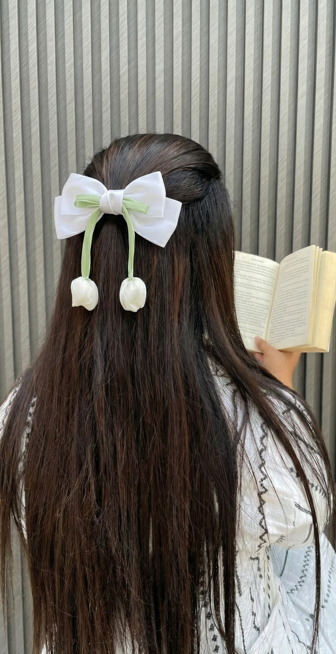 Crafted from soft, shimmering fabric and overlaid with delicate lace, this oversized bow features subtle rhinestone detailing for a touch of sparkle. The design is finished with two flowing ribbons, each ending in a plush, handcrafted tulip bud. It is the ultimate accessory for perfecting the trending "Coquette" or "Cottage core" look.